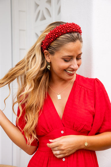 Elevate your look with this stunning beaded headband, available in red or white. Carefully crafted with intricate bead detailing, this accessory ad...
