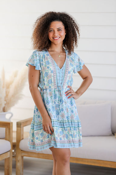 Above the Knee Length V Neckline Short Flowy Sleeves Buttons from Bust Down Pull in Tie-up under the Bust Floral Print Frilled Hem Unlined 100% Ra...