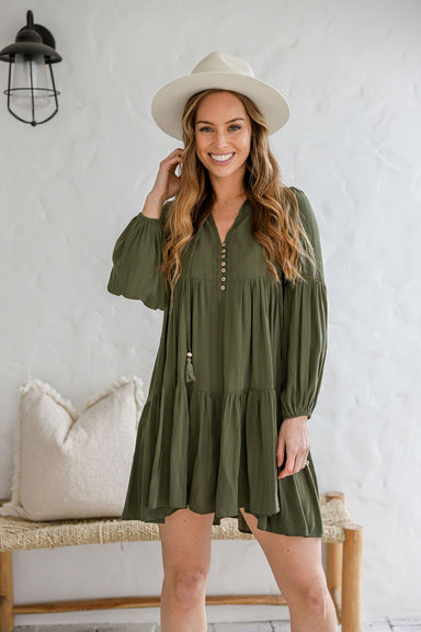 Midi Length Dress Long Sleeves with Elastic Cuffs V Neckline with Tie-up Buttons above the bust Tiered Ruffle Detailing 100% Rayon Unlined All siz...