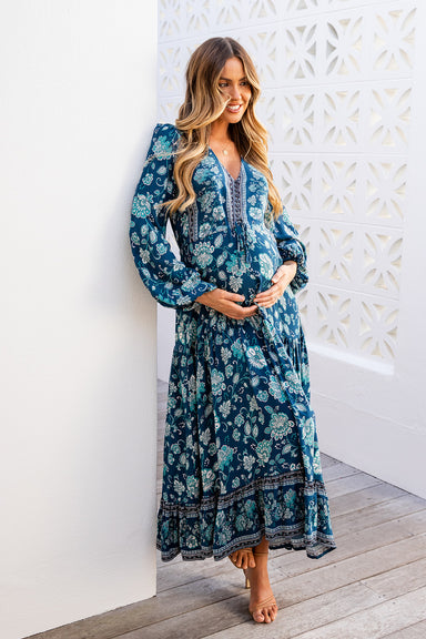 Maxi Length Dress V Neckline Long Sleeves with Elastic Cuffs Buttons from Bust Down Tie-Up Under the Bust Unlined 100% Rayon All sizing is in Aust...