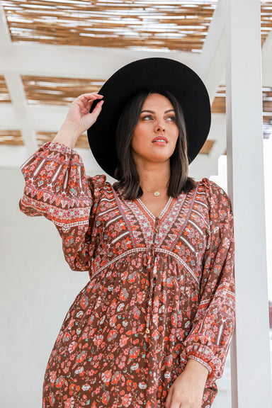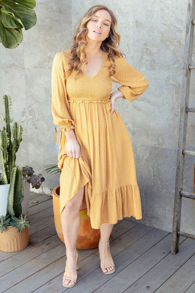Midi/Maxi Length V Neckline Shirred Bodice Side Pockets Button at Back Long Sleeves with Elastic Cuff 100% Rayon Gathered Detailing All sizing is...