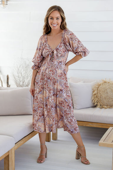 Midi Length Dress Elbow Length Balloon Sleeves with Elastic Cuff Low Neckline with Tie Up at Bust Elastic Waistband on the Back Unlined 100% Rayo...