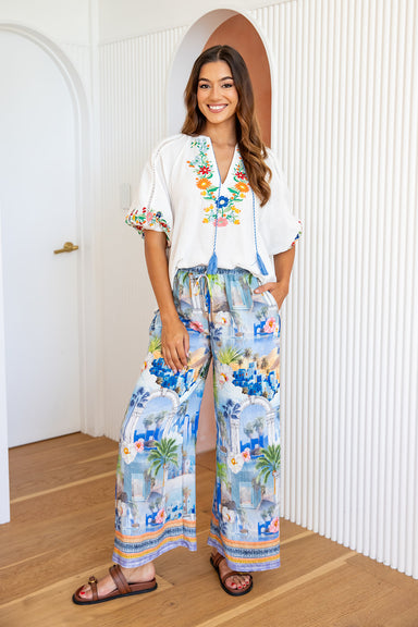 Culotte Style Pants Elastic Waistband Drawstring with Tassel Embroidered Details Side Pockets Unlined 100% Rayon All sizing is in Australian. Ple...