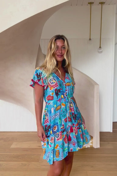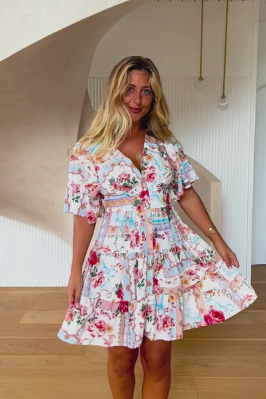 Mini Length V Neckline Embroidered Borders Flowy Cap Sleeves Buttons from Bust Down Pull in Tie-up under the Bust 100% Rayon All sizing is in Aus...