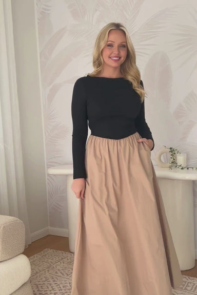 Maxi Length Jersey Elastic Torso Side Pockets Long Sleeve Torso: 48% Cotton/46% Rayon/8% Elastane Woven: 100% Cotton All sizing is in Australia...