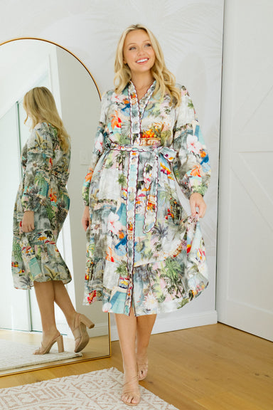 Mini Length Long Sleeve with Cuff Unattached Belt Buttons Down Front Embroidered Details 100% Rayon All sizing is in Australian. Please use the si...
