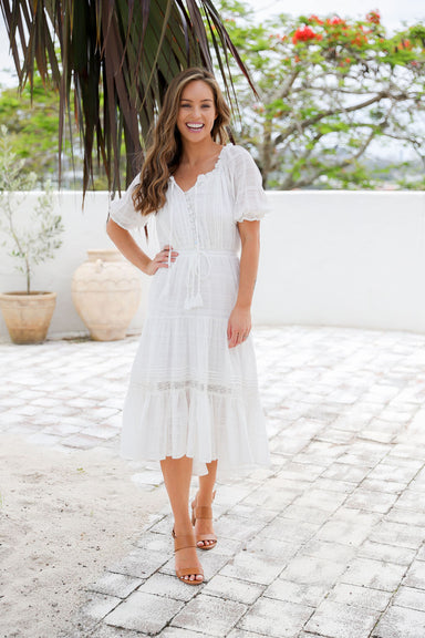 Midi Length Drawstring and Tie-up Collar Adjustable Button Shoulder Strap Elastic Waistband 100% Cotton Lining: 100% Rayon All sizing is in Austra...