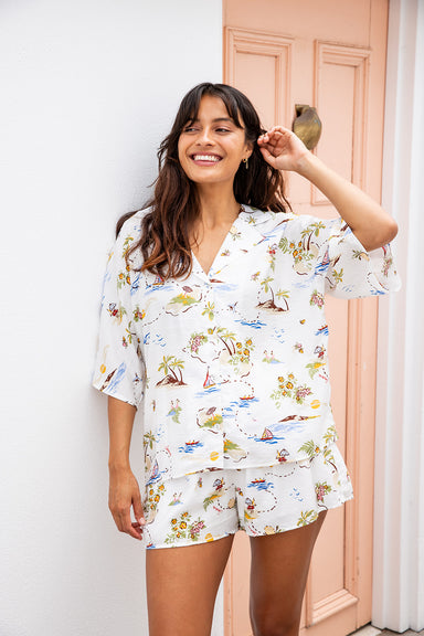 Collared Shirt V-Neckline Elbow Length Sleeve Buttons Down Torso Relaxed Fit 100% Cotton Note: Pair with the Leta Shorts for the perfect set! All...